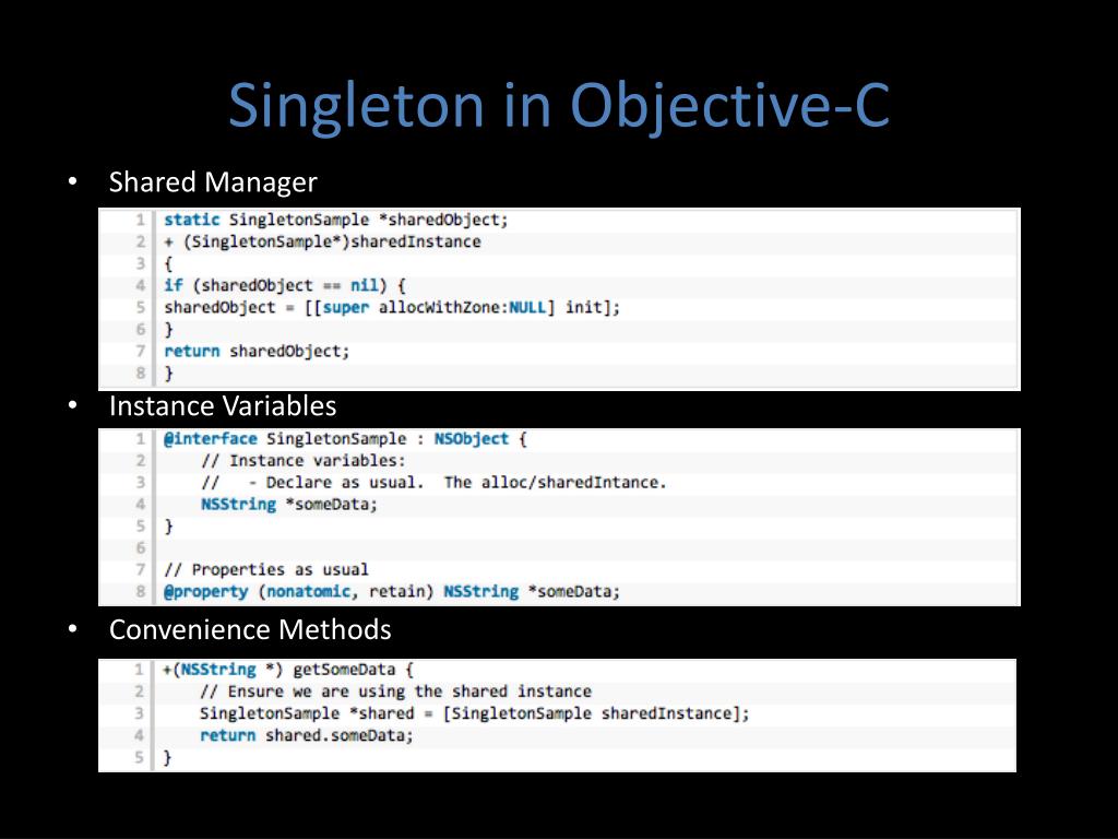 Singleton in Objective-C • Shared Manager • Instance Variables • Convenience Methods