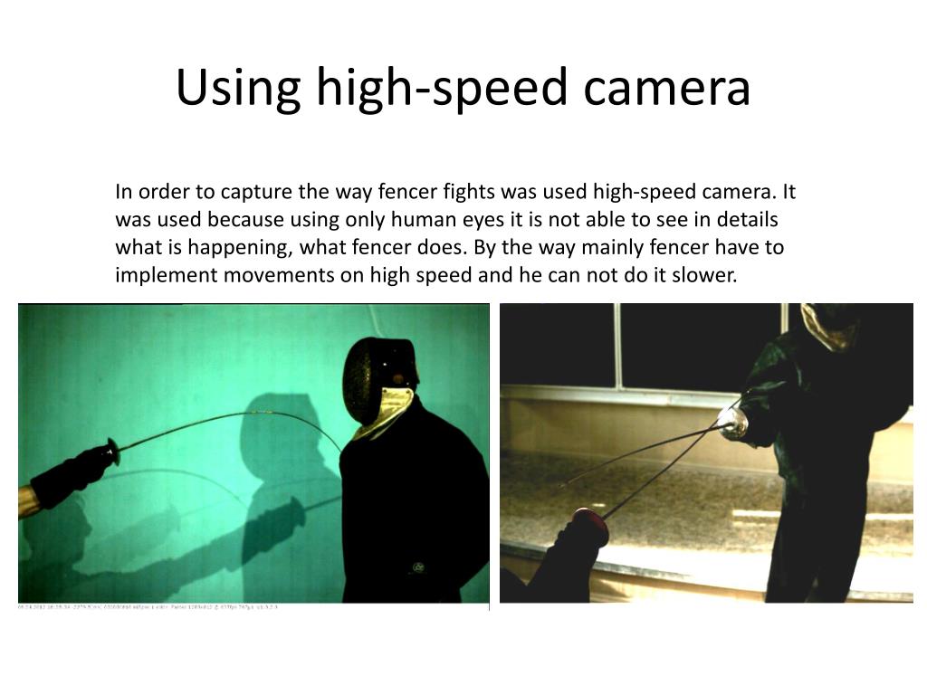 Using high-speed camera In order to capture the way fencer fights was used high-speed camera. It was used because using only human eyes it is not able to see in details what is happening, what fencer does. By the way mainly fencer have to implement movements on high speed and he can not do it slower.