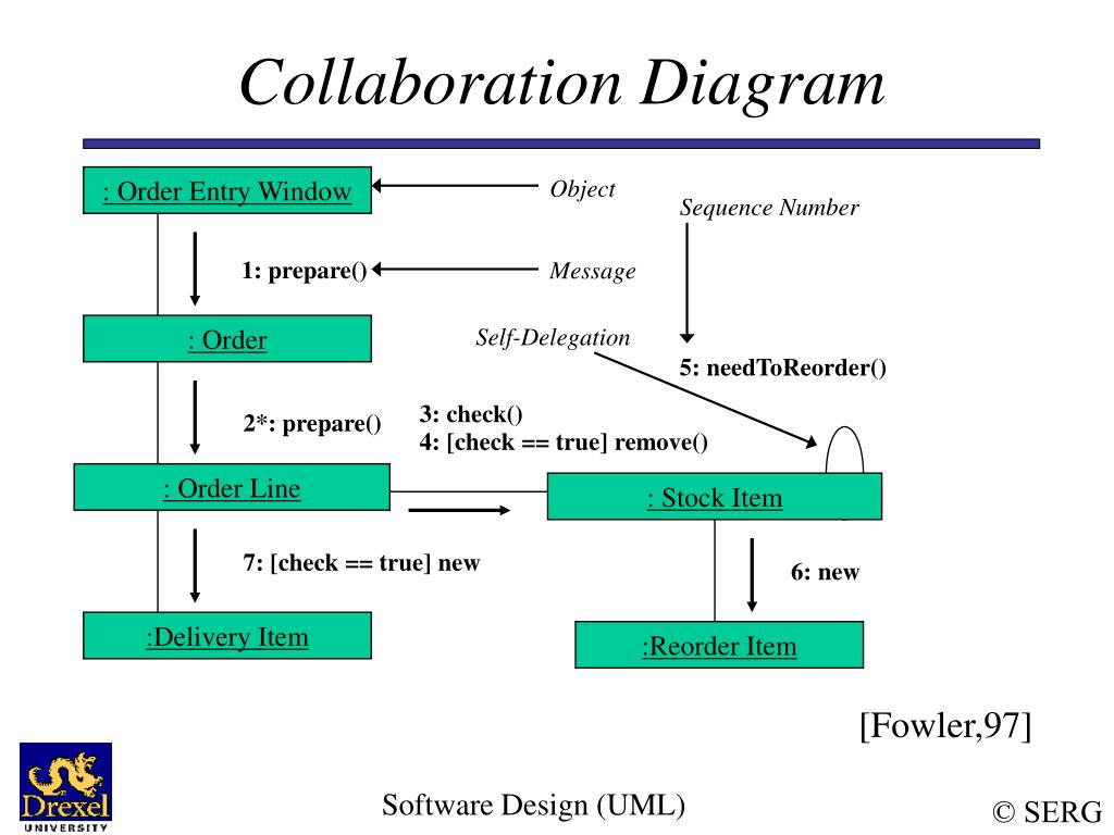 : Order Entry Window Object Sequence Number 1: prepare() Message : Order Self-Delegation 5: needToReorder() 3: check() 2*: prepare() 4: [check == true] remove() : Order Line : Stock Item 7: [check == true] new 6: new :Delivery Item :Reorder Item [Fowler,97] Collaboration Diagram Software Design (UML)