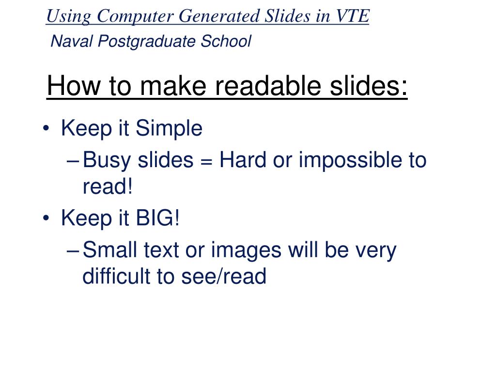 How to make readable slides: • Keep it Simple • Busy slides = Hard or impossible to read! • Keep it BIG! • Small text or images will be very difficult to see/read