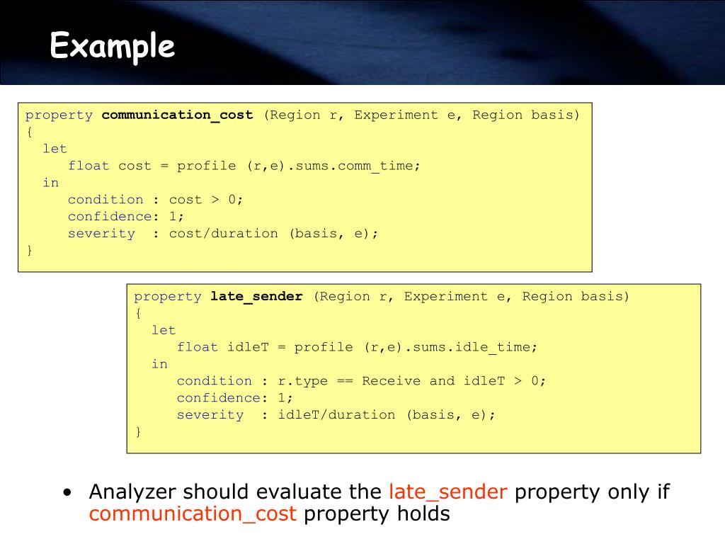 Example propertycommunication_cost (Region r, Experiment e, Region basis){let float cost = profile (r,e).sums.comm_time; in condition : cost > 0; confidence: 1; severity : cost/duration (basis, e); } • Analyzer should evaluate the late_sender property only if communication_cost property holds • Properties create natural hierarchies propertylate_sender (Region r, Experiment e, Region basis){let float idleT = profile (r,e).sums.idle_time; in condition : r.type == Receive and idleT > 0; confidence: 1; severity : idleT/duration (basis, e); }