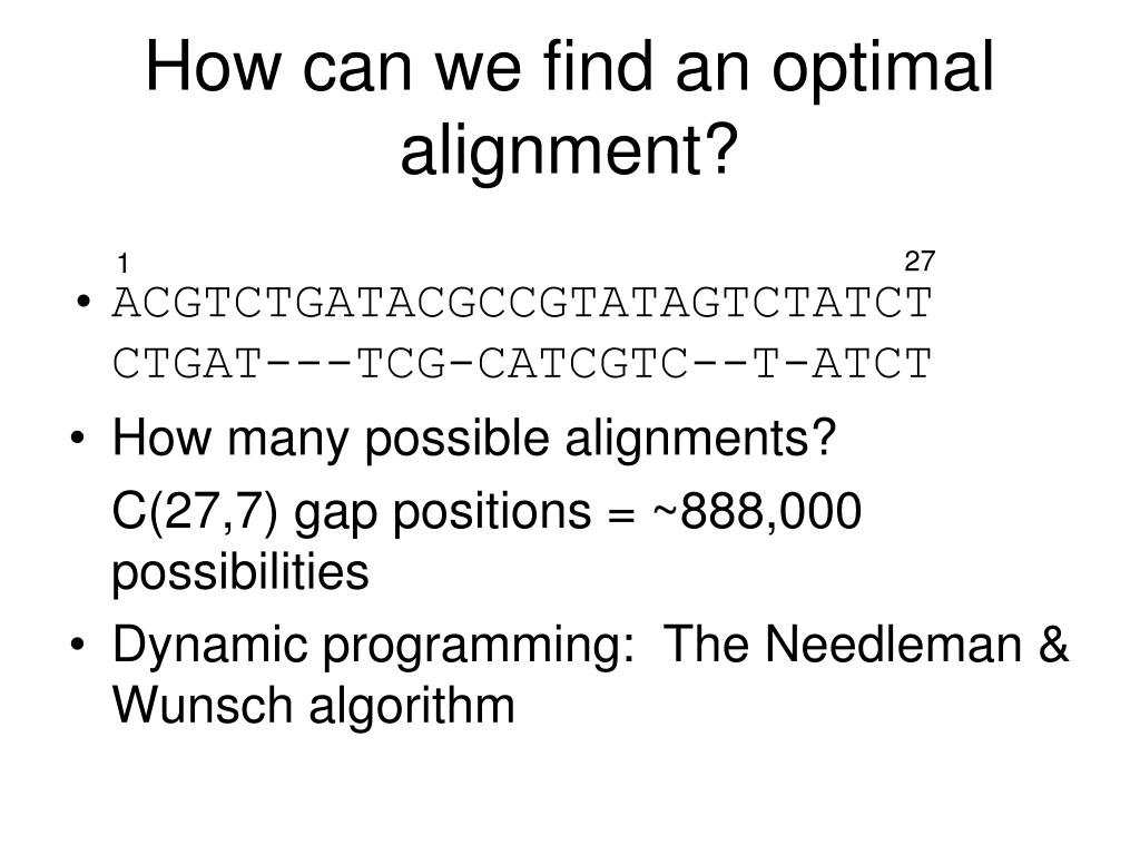 How can we find an optimal alignment? • ACGTCTGATACGCCGTATAGTCTATCTCTGAT---TCG-CATCGTC--T-ATCT • How many possible alignments? C(27,7) gap positions = ~888,000 possibilities • Dynamic programming: The Needleman & Wunsch algorithm 27 1