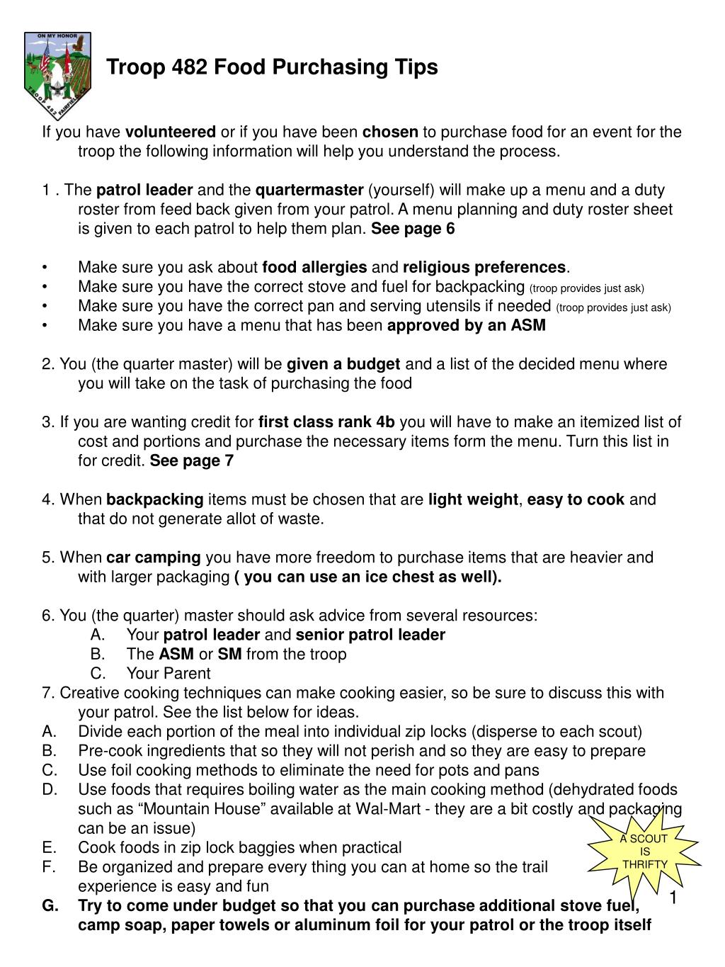 Troop 482 Food Purchasing Tips • If you have volunteered or if you have been chosen to purchase food for an event for the troop the following information will help you understand the process. • 1 . The patrol leader and the quartermaster (yourself) will make up a menu and a duty roster from feed back given from your patrol. A menu planning and duty roster sheet is given to each patrol to help them plan. See page 6 • Make sure you ask about food allergies and religious preferences. • Make sure you have the correct stove and fuel for backpacking (troop provides just ask) • Make sure you have the correct pan and serving utensils if needed (troop provides just ask) • Make sure you have a menu that has been approved by an ASM • 2. You (the quarter master) will be given a budget and a list of the decided menu where you will take on the task of purchasing the food • 3. If you are wanting credit for first class rank 4b you will have to make an itemized list of cost and portions and purchase the necessary items form the menu. Turn this list in for credit. See page 7 • 4. When backpacking items must be chosen that are light weight, easy to cook and that do not generate allot of waste. • 5. When car camping you have more freedom to purchase items that are heavier and with larger packaging ( you can use an ice chest as well). • 6. You (the quarter) master should ask advice from several resources: • Your patrol leader and senior patrol leader • The ASM or SM from the troop • Your Parent • 7. Creative cooking techniques can make cooking easier, so be sure to discuss this with your patrol. See the list below for ideas. • Divide each portion of the meal into individual zip locks (disperse to each scout) • Pre-cook ingredients that so they will not perish and so they are easy to prepare • Use foil cooking methods to eliminate the need for pots and pans • Use foods that requires boiling water as the main cooking method (dehydrated foods such as “Mountain House” available at Wal-Mart - they are a bit costly and packaging can be an issue) • Cook foods in zip lock baggies when practical • Be organized and prepare every thing you can at home so the trail • experience is easy and fun • Try to come under budget so that you can purchase additional stove fuel, camp soap, paper towels or aluminum foil for your patrol or the troop itself A SCOUT IS THRIFTY