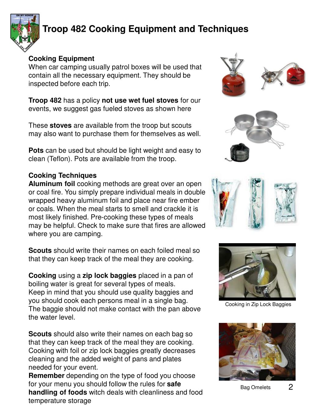 Troop 482 Cooking Equipment and Techniques Cooking Equipment When car camping usually patrol boxes will be used that contain all the necessary equipment. They should be inspected before each trip. Troop 482 has a policy not use wet fuel stoves for our events, we suggest gas fueled stoves as shown here These stoves are available from the troop but scouts may also want to purchase them for themselves as well. Pots can be used but should be light weight and easy to clean (Teflon). Pots are available from the troop. Cooking Techniques Aluminum foil cooking methods are great over an open or coal fire. You simply prepare individual meals in double wrapped heavy aluminum foil and place near fire ember or coals. When the meal starts to smell and crackle it is most likely finished. Pre-cooking these types of meals may be helpful. Check to make sure that fires are allowed where you are camping. Scouts should write their names on each foiled meal so that they can keep track of the meal they are cooking. Cooking using a zip lock baggies placed in a pan of boiling water is great for several types of meals. Keep in mind that you should use quality baggies and you should cook each persons meal in a single bag. The baggie should not make contact with the pan above the water level. Scouts should also write their names on each bag so that they can keep track of the meal they are cooking. Cooking with foil or zip lock baggies greatly decreases cleaning and the added weight of pans and plates needed for your event. Remember depending on the type of food you choose for your menu you should follow the rules for safe handling of foods witch deals with cleanliness and food temperature storage Cooking in Zip Lock Baggies Bag Omelets