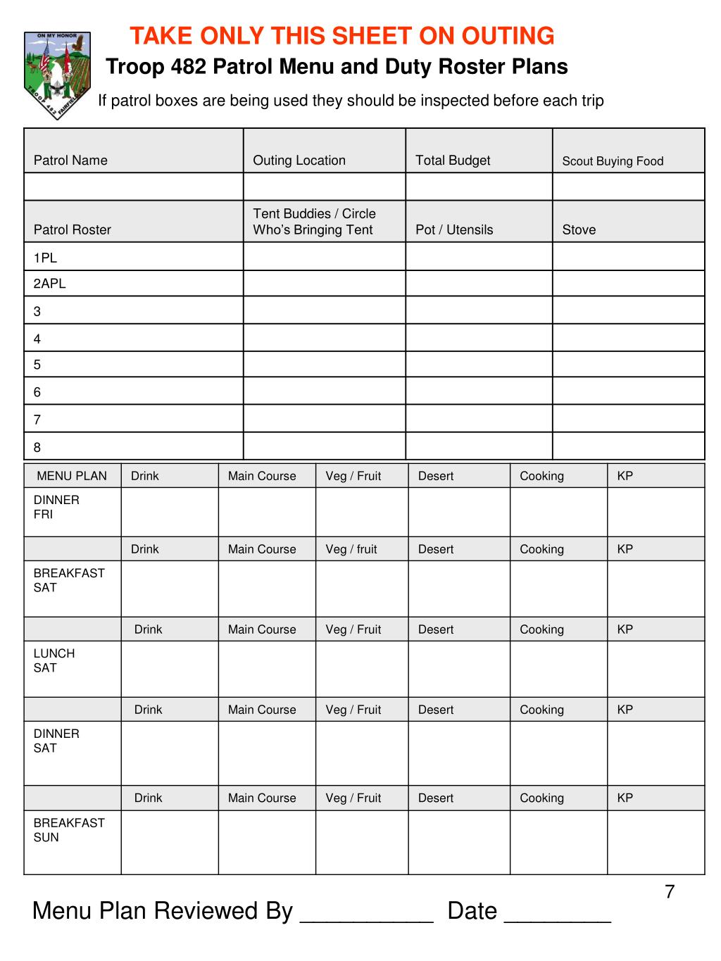 TAKE ONLY THIS SHEET ON OUTING Troop 482 Patrol Menu and Duty Roster Plans If patrol boxes are being used they should be inspected before each trip Menu Plan Reviewed By __________ Date ________