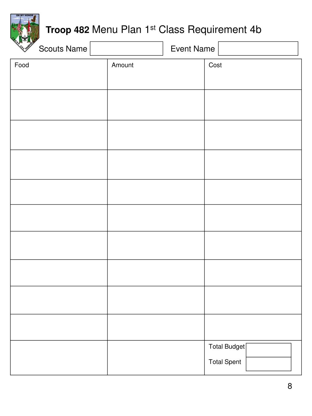 Troop 482 Menu Plan 1st Class Requirement 4b Scouts Name Event Name
