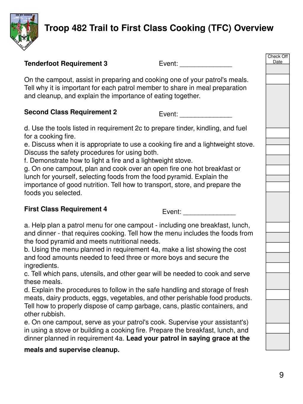 Troop 482 Trail to First Class Cooking (TFC) Overview Check Off Date Tenderfoot Requirement 3 On the campout, assist in preparing and cooking one of your patrol's meals. Tell why it is important for each patrol member to share in meal preparation and cleanup, and explain the importance of eating together. Second Class Requirement 2 d. Use the tools listed in requirement 2c to prepare tinder, kindling, and fuel for a cooking fire.e. Discuss when it is appropriate to use a cooking fire and a lightweight stove. Discuss the safety procedures for using both.f. Demonstrate how to light a fire and a lightweight stove.g. On one campout, plan and cook over an open fire one hot breakfast or lunch for yourself, selecting foods from the food pyramid. Explain the importance of good nutrition. Tell how to transport, store, and prepare the foods you selected. First Class Requirement 4 a. Help plan a patrol menu for one campout - including one breakfast, lunch, and dinner - that requires cooking. Tell how the menu includes the foods from the food pyramid and meets nutritional needs.b. Using the menu planned in requirement 4a, make a list showing the cost and food amounts needed to feed three or more boys and secure the ingredients.c. Tell which pans, utensils, and other gear will be needed to cook and serve these meals.d. Explain the procedures to follow in the safe handling and storage of fresh meats, dairy products, eggs, vegetables, and other perishable food products. Tell how to properly dispose of camp garbage, cans, plastic containers, and other rubbish.e. On one campout, serve as your patrol's cook. Supervise your assistant's) in using a stove or building a cooking fire. Prepare the breakfast, lunch, and dinner planned in requirement 4a. Lead your patrol in saying grace at the meals and supervise cleanup. Event: ______________ Event: ______________ Event: ______________