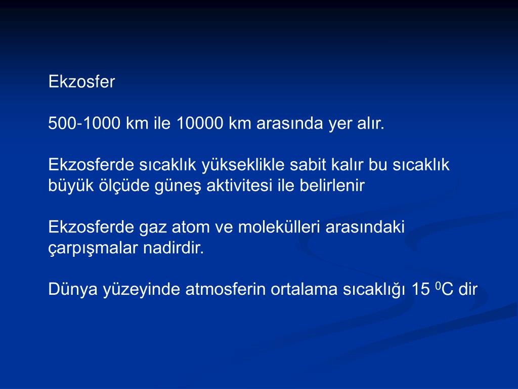 Ekzosfer 500-1000 km ile 10000 km arasında yer alır. Ekzosferde sıcaklık yükseklikle sabit kalır bu sıcaklık büyük ölçüde güneş aktivitesi ile belirlenir Ekzosferde gaz atom ve molekülleri arasındaki çarpışmalar nadirdir. Dünya yüzeyinde atmosferin ortalama sıcaklığı 15 0C dir