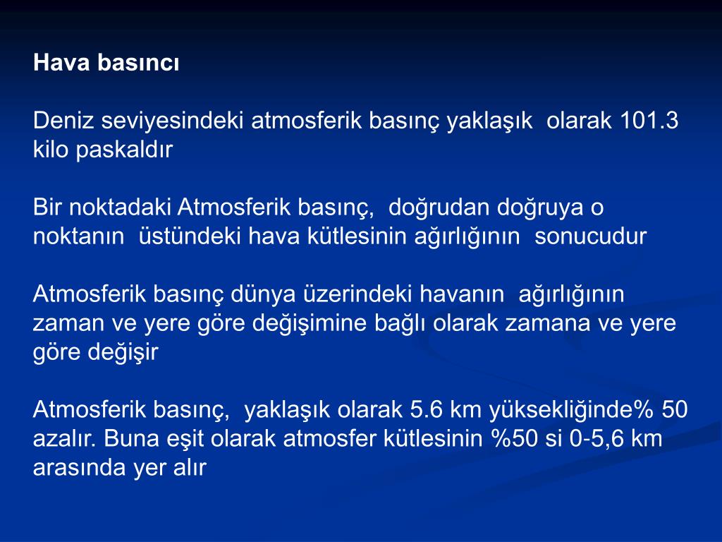 Hava basıncı Deniz seviyesindeki atmosferik basınç yaklaşık olarak 101.3 kilo paskaldır Bir noktadaki Atmosferik basınç, doğrudan doğruya o noktanın üstündeki hava kütlesinin ağırlığının sonucudur Atmosferik basınç dünya üzerindeki havanın ağırlığının zaman ve yere göre değişimine bağlı olarak zamana ve yere göre değişir Atmosferik basınç, yaklaşık olarak 5.6 km yüksekliğinde% 50 azalır. Buna eşit olarak atmosfer kütlesinin %50 si 0-5,6 km arasında yer alır