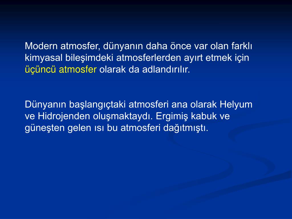 Modern atmosfer, dünyanın daha önce var olan farklı kimyasal bileşimdeki atmosferlerden ayırt etmek için üçüncü atmosfer olarak da adlandırılır. Dünyanın başlangıçtaki atmosferi ana olarak Helyum ve Hidrojenden oluşmaktaydı. Ergimiş kabuk ve güneşten gelen ısı bu atmosferi dağıtmıştı.