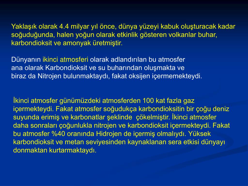 Yaklaşık olarak 4.4 milyar yıl önce, dünya yüzeyi kabuk oluşturacak kadar soğuduğunda, halen yoğun olarak etkinlik gösteren volkanlar buhar, karbondioksit ve amonyak üretmiştir. Dünyanın ikinci atmosferi olarak adlandırılan bu atmosfer ana olarak Karbondioksit ve su buharından oluşmakta ve biraz da Nitrojen bulunmaktaydı, fakat oksijen içermemekteydi. İkinci atmosfer günümüzdeki atmosferden 100 kat fazla gaz içermekteydi. Fakat atmosfer soğudukça karbondioksitin bir çoğu deniz suyunda erimiş ve karbonatlar şeklinde çökelmiştir. İkinci atmosfer daha sonraları çoğunlukla nitrojen ve karbondioksit içermekteydi. Fakat bu atmosfer %40 oranında Hidrojen de içermiş olmalıydı. Yüksek karbondioksit ve metan seviyesinden kaynaklanan sera etkisi dünyayı donmaktan kurtarmaktaydı.