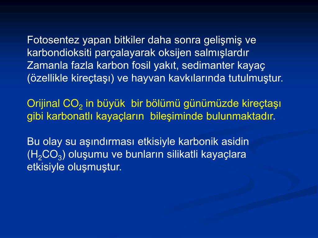 Fotosentez yapan bitkiler daha sonra gelişmiş ve karbondioksiti parçalayarak oksijen salmışlardır Zamanla fazla karbon fosil yakıt, sedimanter kayaç (özellikle kireçtaşı) ve hayvan kavkılarında tutulmuştur. Orijinal CO2 in büyük bir bölümü günümüzde kireçtaşı gibi karbonatlı kayaçların bileşiminde bulunmaktadır. Bu olay su aşındırması etkisiyle karbonik asidin (H2CO3) oluşumu ve bunların silikatli kayaçlara etkisiyle oluşmuştur.