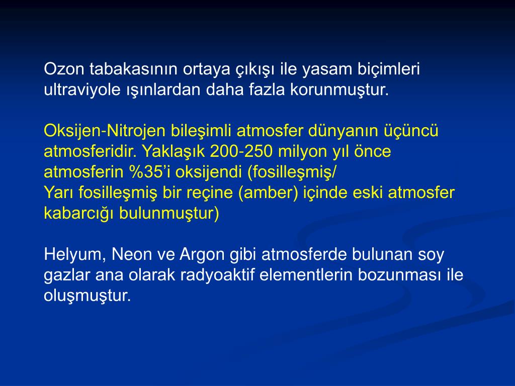 Ozon tabakasının ortaya çıkışı ile yasam biçimleri ultraviyole ışınlardan daha fazla korunmuştur. Oksijen-Nitrojen bileşimli atmosfer dünyanın üçüncü atmosferidir. Yaklaşık 200-250 milyon yıl önce atmosferin %35’i oksijendi (fosilleşmiş/ Yarı fosilleşmiş bir reçine (amber) içinde eski atmosfer kabarcığı bulunmuştur) Helyum, Neon ve Argon gibi atmosferde bulunan soy gazlar ana olarak radyoaktif elementlerin bozunması ile oluşmuştur.