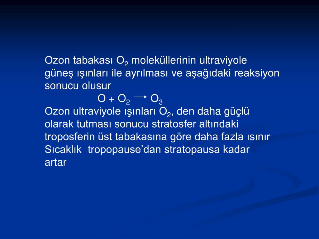 Ozon tabakası O2 moleküllerinin ultraviyole güneş ışınları ile ayrılması ve aşağıdaki reaksiyon sonucu olusur O + O2 O3 Ozon ultraviyole ışınları O2, den daha güçlü olarak tutması sonucu stratosfer altındaki troposferin üst tabakasına göre daha fazla ısınır Sıcaklık tropopause’dan stratopausa kadar artar