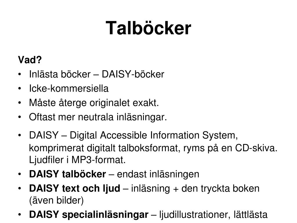 Talböcker Vad? • Inlästa böcker – DAISY-böcker • Icke-kommersiella • Måste återge originalet exakt. • Oftast mer neutrala inläsningar. • DAISY – Digital Accessible Information System,komprimerat digitalt talboksformat, ryms på en CD-skiva. Ljudfiler i MP3-format. • DAISY talböcker – endast inläsningen • DAISY text och ljud – inläsning + den tryckta boken (även bilder) • DAISY specialinläsningar – ljudillustrationer, lättlästa