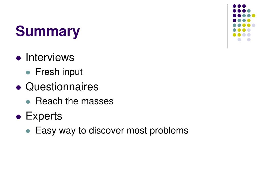 Summary • Interviews • Fresh input • Questionnaires • Reach the masses • Experts • Easy way to discover most problems