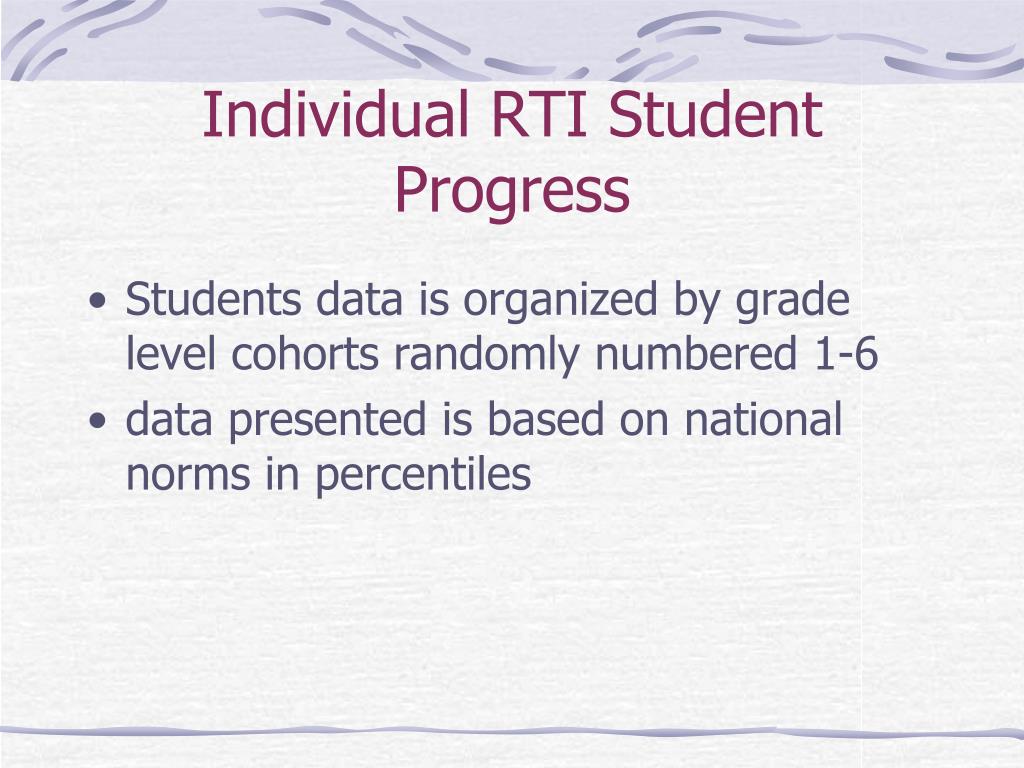 Individual RTI Student Progress • Students data is organized by grade level cohorts randomly numbered 1-6 • data presented is based on national norms in percentiles