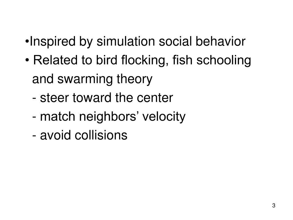 Inspired by simulation social behavior • Related to bird flocking, fish schooling and swarming theory - steer toward the center - match neighbors’ velocity - avoid collisions