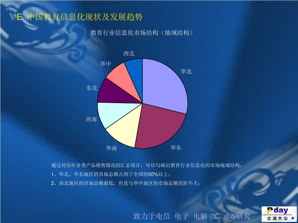 E 中国教育信息化现状及发展趋势 通过对历年各类产品销售情况的汇总统计,可以勾画出教育行业信息化的市场地域结构: 1、华北、华东地区的市场总额占到了全国的50%以上; 2、西北地区的市场总额最低,但是与华中地区的市场总额差距不大;