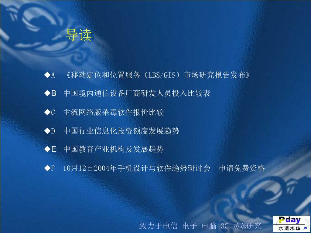 导读 • A 《移动定位和位置服务(LBS/GIS)市场研究报告发布》 • B 中国境内通信设备厂商研发人员投入比较表 • C 主流网络版杀毒软件报价比较 • D 中国行业信息化投资额度发展趋势 • E 中国教育产业机构及发展趋势 • F 10月12日2004年手机设计与软件趋势研讨会 申请免费资格