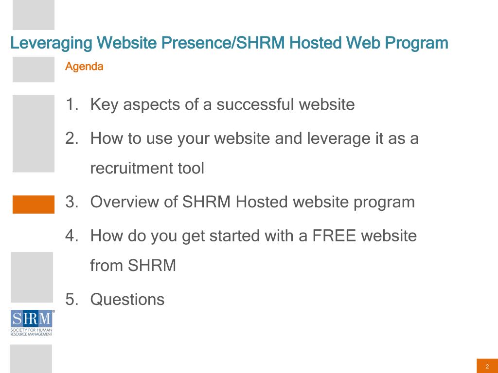 Leveraging Website Presence/SHRM Hosted Web Program Agenda Key aspects of a successful website How to use your website and leverage it as a recruitment tool Overview of SHRM Hosted website program How do you get started with a FREE website from SHRM Questions