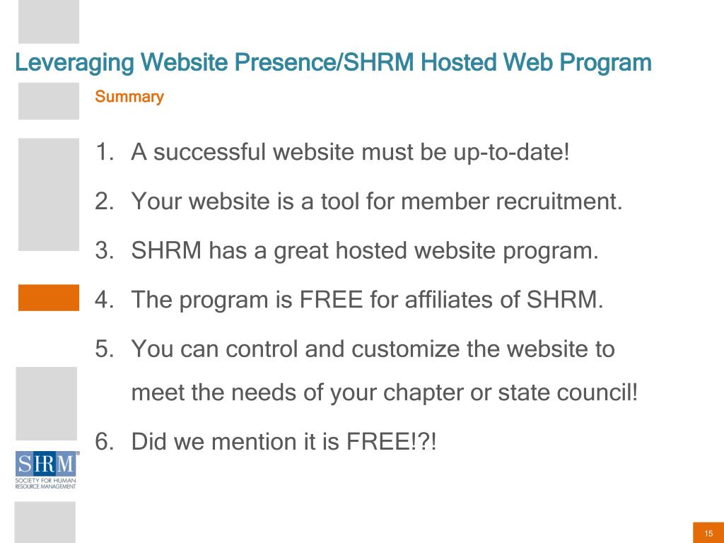Leveraging Website Presence/SHRM Hosted Web Program Summary A successful website must be up-to-date! Your website is a tool for member recruitment. SHRM has a great hosted website program. The program is FREE for affiliates of SHRM. You can control and customize the website to meet the needs of your chapter or state council! Did we mention it is FREE!?!