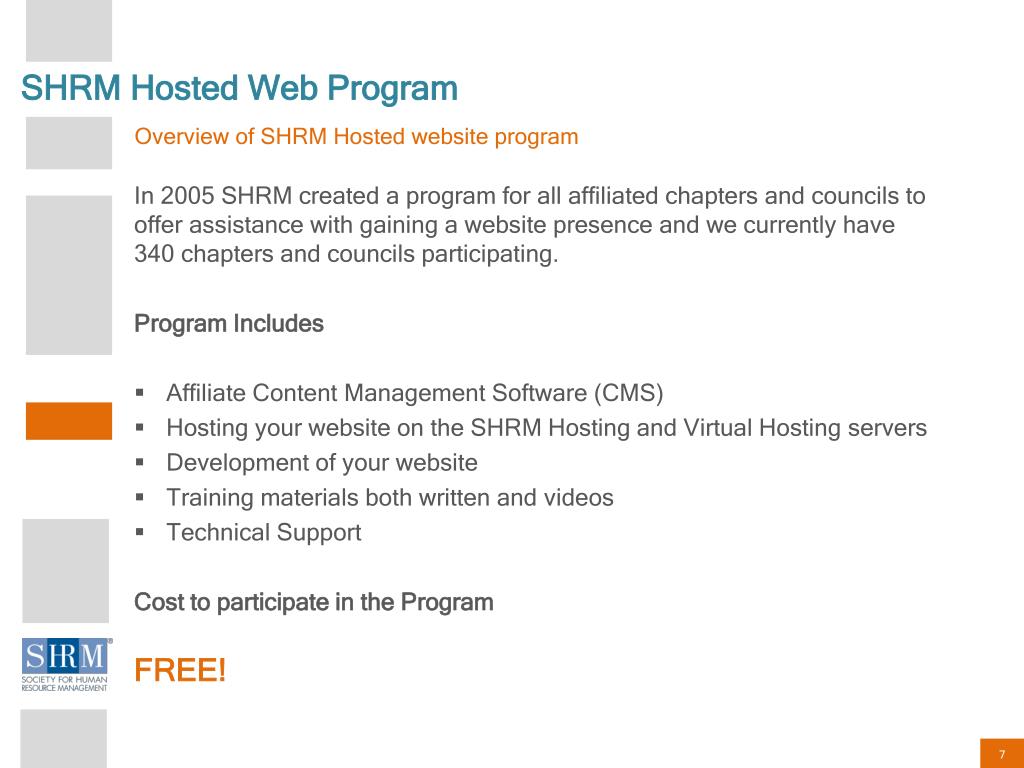 SHRM Hosted Web Program Overview of SHRM Hosted website program In 2005 SHRM created a program for all affiliated chapters and councils to offer assistance with gaining a website presence and we currently have 340 chapters and councils participating. Program Includes Affiliate Content Management Software (CMS) Hosting your website on the SHRM Hosting and Virtual Hosting servers Development of your website Training materials both written and videos Technical Support Cost to participate in the Program FREE!