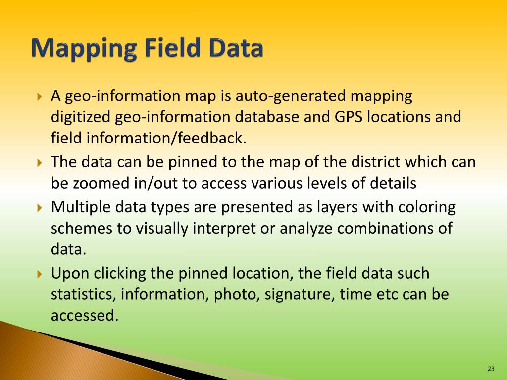 Mapping Field Data • A geo-information map is auto-generated mapping digitized geo-information database and GPS locations and field information/feedback. • The data can be pinned to the map of the district which can be zoomed in/out to access various levels of details • Multiple data types are presented as layers with coloring schemes to visually interpret or analyze combinations of data. • Upon clicking the pinned location, the field data such statistics, information, photo, signature, time etc can be accessed.