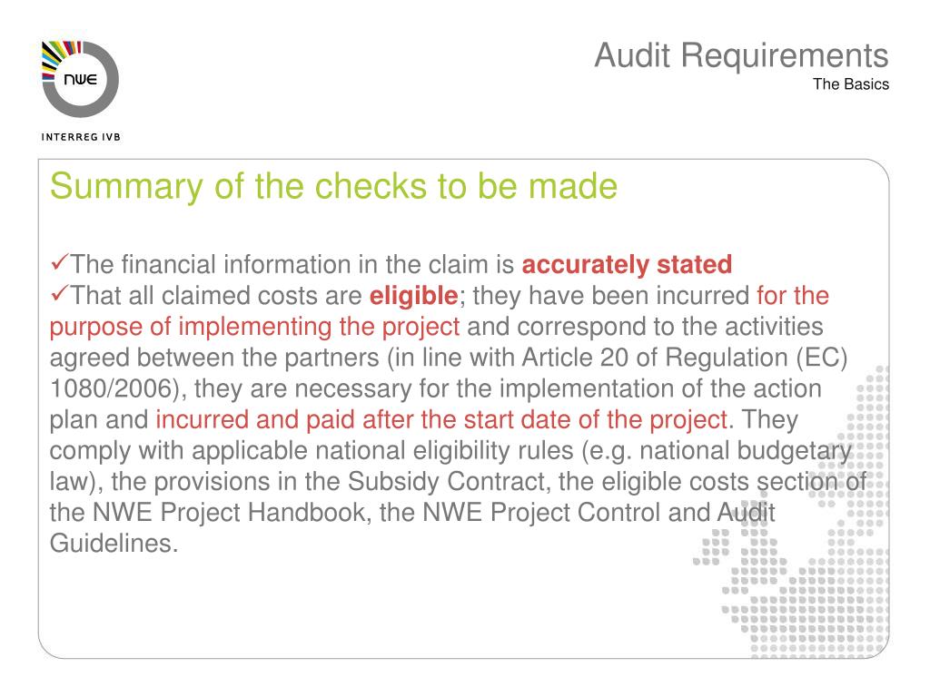 Audit Requirements The Basics Summary of the checks to be made • The financial information in the claim is accurately stated • That all claimed costs are eligible; they have been incurred for the purpose of implementing the project and correspond to the activities agreed between the partners (in line with Article 20 of Regulation (EC) 1080/2006), they are necessary for the implementation of the action plan and incurred and paid after the start date of the project. They comply with applicable national eligibility rules (e.g. national budgetary law), the provisions in the Subsidy Contract, the eligible costs section of the NWE Project Handbook, the NWE Project Control and Audit Guidelines.