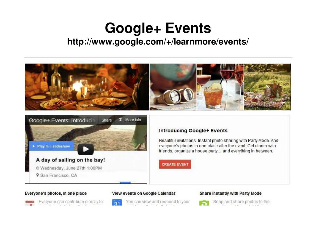 Google+ Communities (Public & Private) • Public communities –anyone can join. • Public but moderator approval needed to join • Private but people can find you through search and request to (only members of the community can see existing members and their posts) • Private communities hidden from search – invitation only, community hidden from search • members and their posts are viewable only to existing members