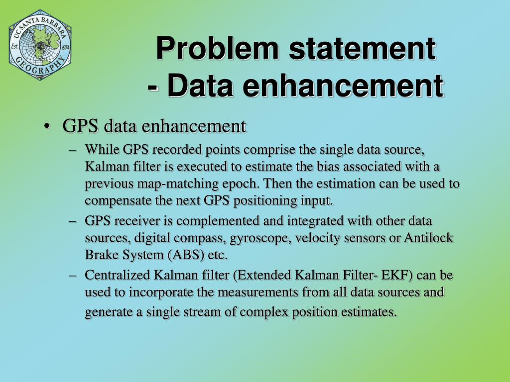 Problem statement- Data enhancement • GPS data enhancement • While GPS recorded points comprise the single data source, Kalman filter is executed to estimate the bias associated with a previous map-matching epoch. Then the estimation can be used to compensate the next GPS positioning input. • GPS receiver is complemented and integrated with other data sources, digital compass, gyroscope, velocity sensors or Antilock Brake System (ABS) etc. • Centralized Kalman filter (Extended Kalman Filter- EKF) can be used to incorporate the measurements from all data sources and generate a single stream of complex position estimates.