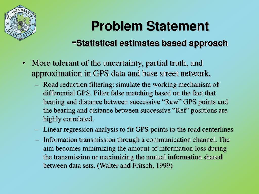 Problem Statement-Statistical estimates based approach • More tolerant of the uncertainty, partial truth, and approximation in GPS data and base street network. • Road reduction filtering:simulate the working mechanism of differential GPS. Filter false matching based on the fact that bearing and distance between successive “Raw” GPS points and the bearing and distance between successive “Ref” positions are highly correlated. • Linear regression analysis to fit GPS points to the road centerlines • Information transmission through a communication channel. The aim becomes minimizing the amount of information loss during the transmission or maximizing the mutual information shared between data sets. (Walter and Fritsch, 1999)