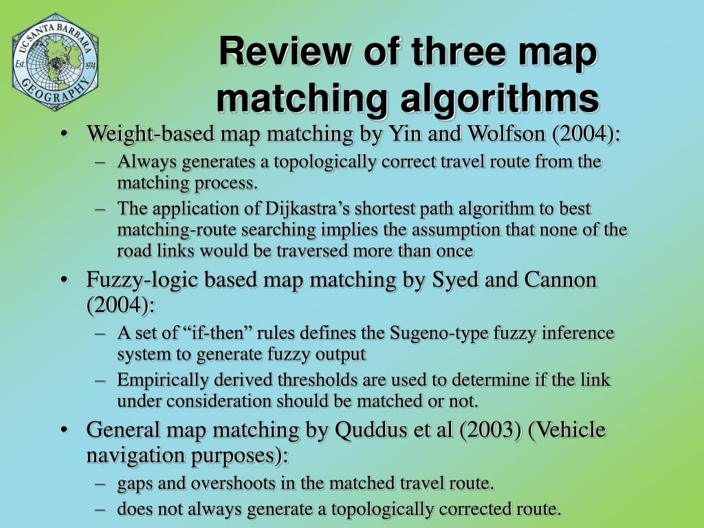 Review of three map matching algorithms • Weight-based map matching by Yin and Wolfson (2004): • Always generates a topologically correct travel route from the matching process. • The application of Dijkastra’s shortest path algorithm to best matching-route searching implies the assumption that none of the road links would be traversed more than once • Fuzzy-logic based map matching by Syed and Cannon (2004): • A set of “if-then” rules defines the Sugeno-type fuzzy inference system to generate fuzzy output • Empirically derived thresholds are used to determine if the link under consideration should be matched or not. • General map matching by Quddus et al (2003) (Vehicle navigation purposes): • gaps and overshoots in the matched travel route. • does not always generate a topologically corrected route.