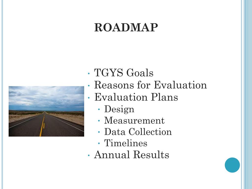 roadmap • TGYS Goals • Reasons for Evaluation • Evaluation Plans • Design • Measurement • Data Collection • Timelines • Annual Results