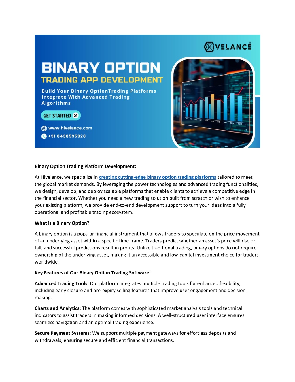 Requirement Analysis: Our experts define the necessary platform functionalities, trading strategies, and analytical features based on your business goals. Algorithm Integration: Reliable trading algorithms are incorporated to enhance system efficiency, accuracy, and transaction security. UI/UX Development: A visually appealing and responsive interface is created to ensure a smooth user experience with intuitive navigation and detailed charts. Frontend & Backend Development: We develop the frontend using frameworks like React.js and Angular.js, while backend development includes server logic, database connectivity, and API integration for third-party functionalities. Testing & Deployment: The platform undergoes multiple testing phases to detect and fix any issues related to performance, security, or usability before its official launch. Technology Stack Used in Our Option Trading Platform: Express.js, React.js, Angular.js, Vue.js TypeScript, C#, Python, Django, .NET MySQL, PostgreSQL, MongoDB HTML, CSS3, JavaScript Docker, Kubernetes, OAuth, JWT Mixpanel, Google Analytics, Datadog, New Relic Why Choose Hivelance for Binary Option Trading Platform Development? Hivelance is a trusted name in trading software development, recognized for delivering robust, secure, and feature-rich binary option trading platforms. Our expertise spans multiple financial technologies, ensuring the final product meets global compliance and performance standards. With deep knowledge of trading algorithms and blockchain integration, we help clients establish a fully functional, high- performing platform designed for maximum profitability. Partner with Hivelance to build a scalable and secure binary option trading platform that empowers your business growth. Know More: Visit –https://www.hivelance.com/binary-option-trading-platform-development WhatsApp - +918438595928, +971505249877 Telegram - Hivelance Mail - sales@hivelance.com Get Free Demo - https://www.hivelance.com/contact-us