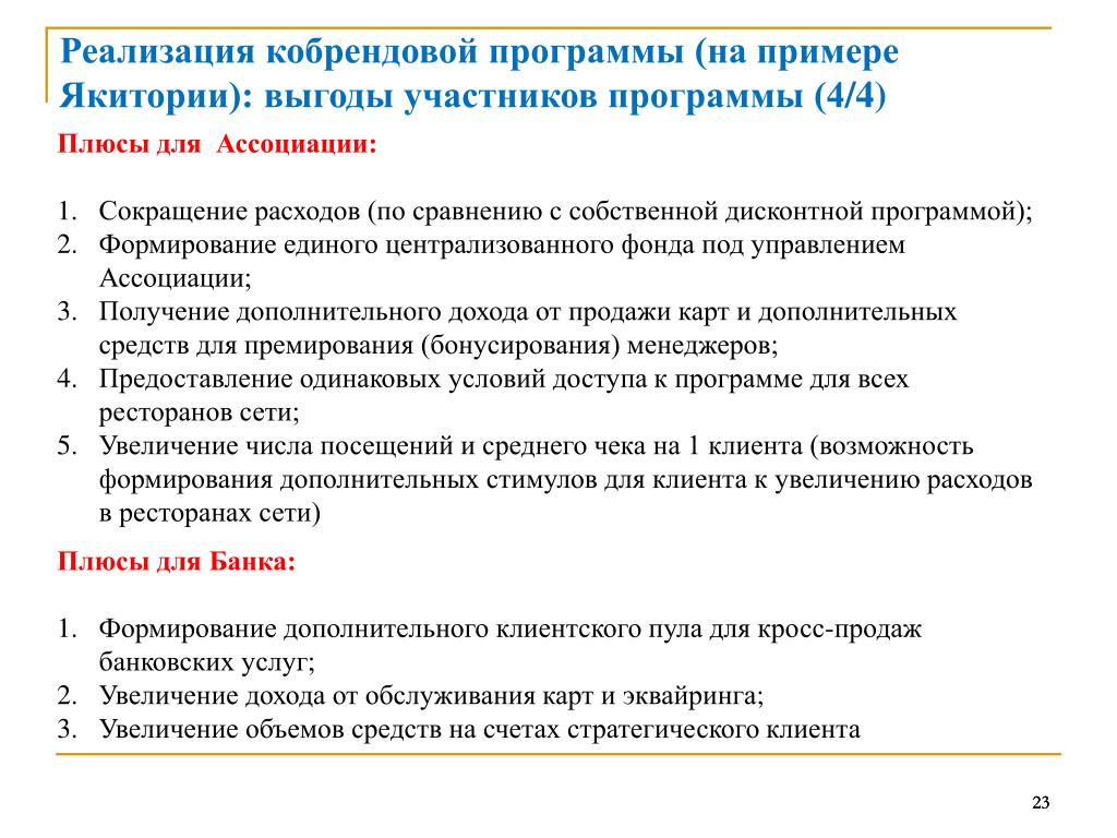 Реализация кобрендовой программы (на примере Якитории): распределение доходов и расходов (3/4) Оплачивает Банк!!! * Все параметры программы подлежат дальнейшему обсуждению ** Возможна эмиссия карт на срок более чем 1 год. При этом раз в год накопленные бонусы могут сгорать *** Постоянные затраты 22