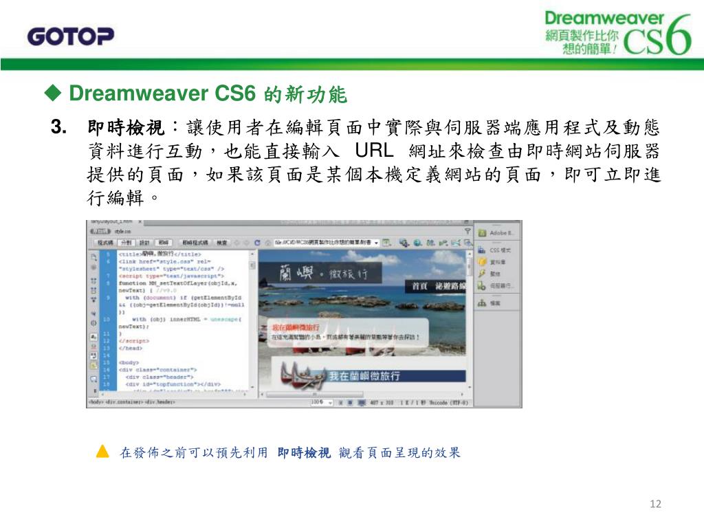 Dreamweaver CS6 的新功能 • 即時檢視:讓使用者在編輯頁面中實際與伺服器端應用程式及動態資料進行互動,也能直接輸入 URL 網址來檢查由即時網站伺服器提供的頁面,如果該頁面是某個本機定義網站的頁面,即可立即進行編輯。 在發佈之前可以預先利用 即時檢視 觀看頁面呈現的效果