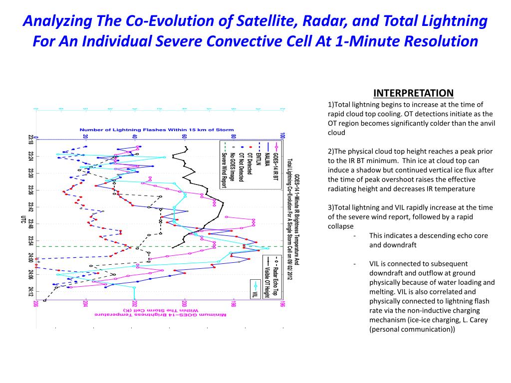 Analyzing The Co-Evolution of Satellite, Radar, and Total Lightning For An Individual Severe Convective Cell At 1-Minute Resolution • INTERPRETATION • Total lightning begins to increase at the time of rapid cloud top cooling. OT detections initiate as the OT region becomes significantly colder than the anvil cloud • The physical cloud top height reaches a peak prior to the IR BT minimum. Thin ice at cloud top can induce a shadow but continued vertical ice flux after the time of peak overshoot raises the effective radiating height and decreases IR temperature • Total lightning and VIL rapidly increase at the time of the severe wind report, followed by a rapid collapse • This indicates a descending echo core and downdraft • VIL is connected to subsequent downdraft and outflow at ground physically because of water loading and melting. VIL is also correlated and physically connected to lightning flash rate via the non-inductive charging mechanism (ice-ice charging, L. Carey (personal communication))