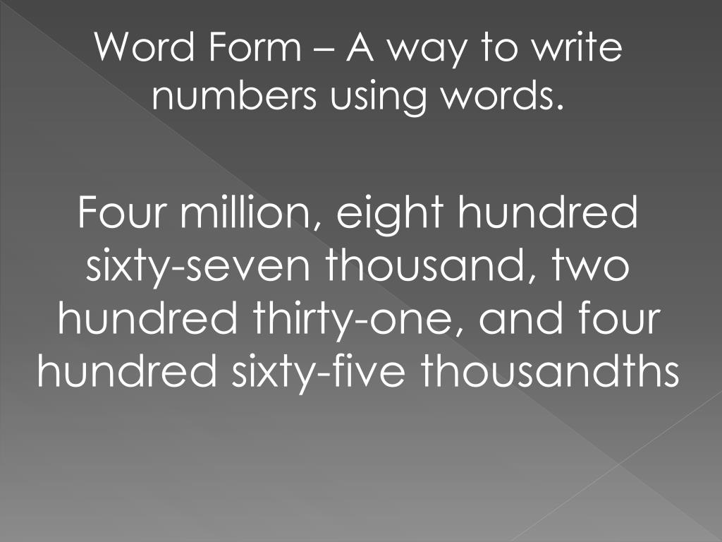 Word Form – A way to write numbers using words. Four million, eight hundred sixty-seven thousand, two hundred thirty-one, and four hundred sixty-five thousandths