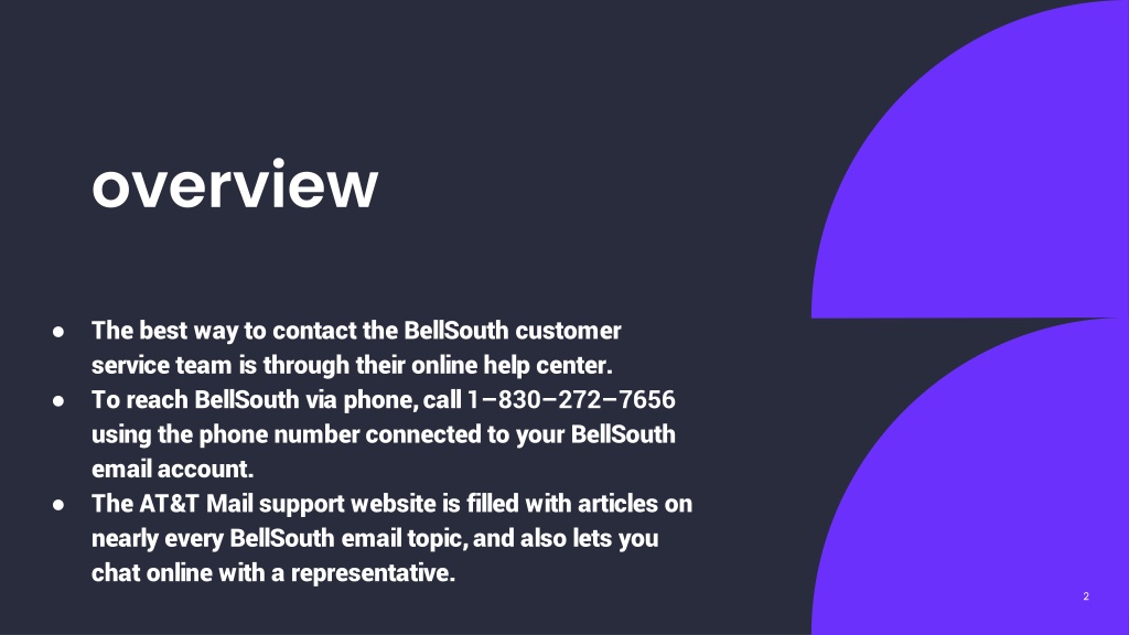 overview The best way to contact the BellSouth customer service team is through their online help center. To reach BellSouth via phone, call 1–830–272–7656 using the phone number connected to your BellSouth email account. The AT&T Mail support website is filled with articles on nearly every BellSouth email topic, and also lets you chat online with a representative.
