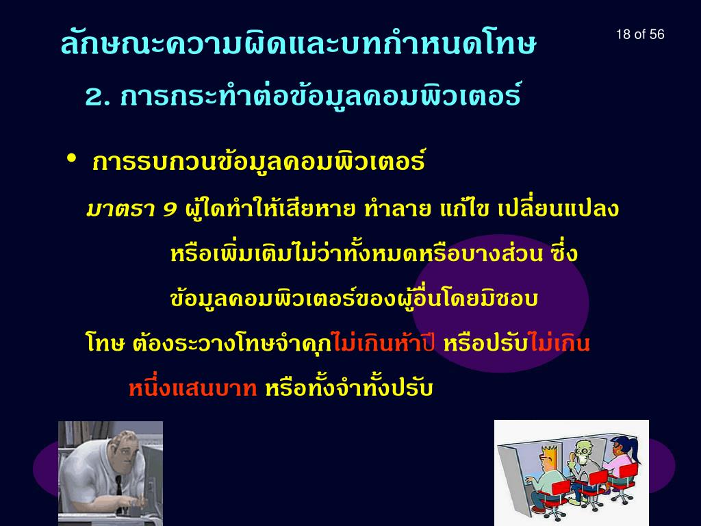ลักษณะความผิดและบทกำหนดโทษลักษณะความผิดและบทกำหนดโทษ 12 of 56 1. การกระทำต่อระบบคอมพิวเตอร์ -การเข้าถึงระบบ (มาตรา 5) - การเปิดเผยมาตรการป้องกันการเข้าถึงระบบ (มาตรา 6) - การรบกวนระบบ (มาตรา 10) 2. การกระทำต่อข้อมูลคอมพิวเตอร์ -การเข้าถึงข้อมูล (มาตรา 7) - การดักข้อมูล (มาตรา 8) - การรบกวนข้อมูล (มาตรา 9) - สแปมเมล์ (มาตรา 11) - การนำเข้า/เผยแพร่ข้อมูลที่ไม่เหมาะสม (มาตรา 14) - การเผยแพร่ภาพตัดต่อในลักษณะหมิ่นประมาท (มาตรา 16) 3. การกระทำผิดต่อความมั่นคง (มาตรา 12) 4. การใช้ชุดคำสั่งกระทำความผิด (มาตรา 13) 5. การกระทำความผิดของผู้ให้บริการ (มาตรา 15, มาตรา 26) 6. การเปิดเผยข้อมูลของพนักงานเจ้าหน้าที่ (มาตรา 24)
