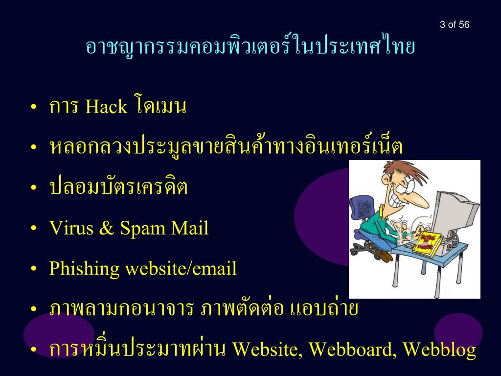 อาชญากรรมคอมพิวเตอร์ในประเทศไทยอาชญากรรมคอมพิวเตอร์ในประเทศไทย 3 of 56 • การ Hack โดเมน • หลอกลวงประมูลขายสินค้าทางอินเทอร์เน็ต • ปลอมบัตรเครดิต • Virus & Spam Mail • Phishing website/email • ภาพลามกอนาจาร ภาพตัดต่อ แอบถ่าย • การหมิ่นประมาทผ่าน Website, Webboard, Webblog