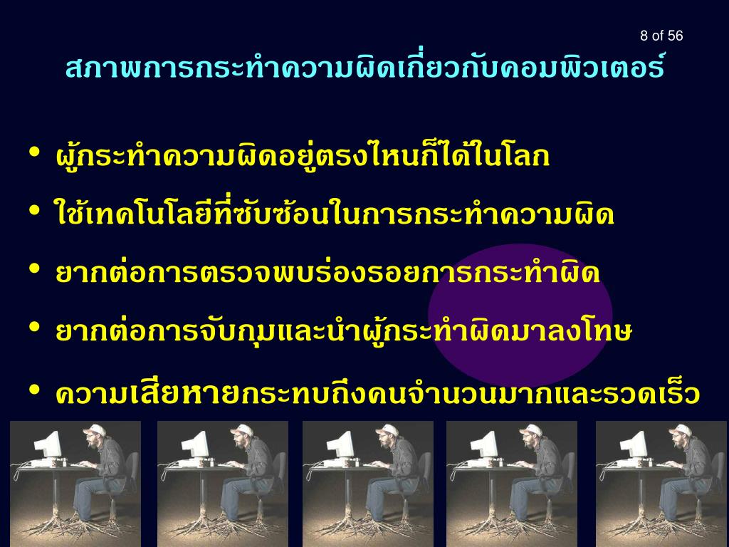 สภาพการกระทำความผิดเกี่ยวกับคอมพิวเตอร์สภาพการกระทำความผิดเกี่ยวกับคอมพิวเตอร์ 8 of 56 • ผู้กระทำความผิดอยู่ตรงไหนก็ได้ในโลก • ใช้เทคโนโลยีที่ซับซ้อนในการกระทำความผิด • ยากต่อการตรวจพบร่องรอยการกระทำผิด • ยากต่อการจับกุมและนำผู้กระทำผิดมาลงโทษ • ความเสียหายกระทบถึงคนจำนวนมากและรวดเร็ว