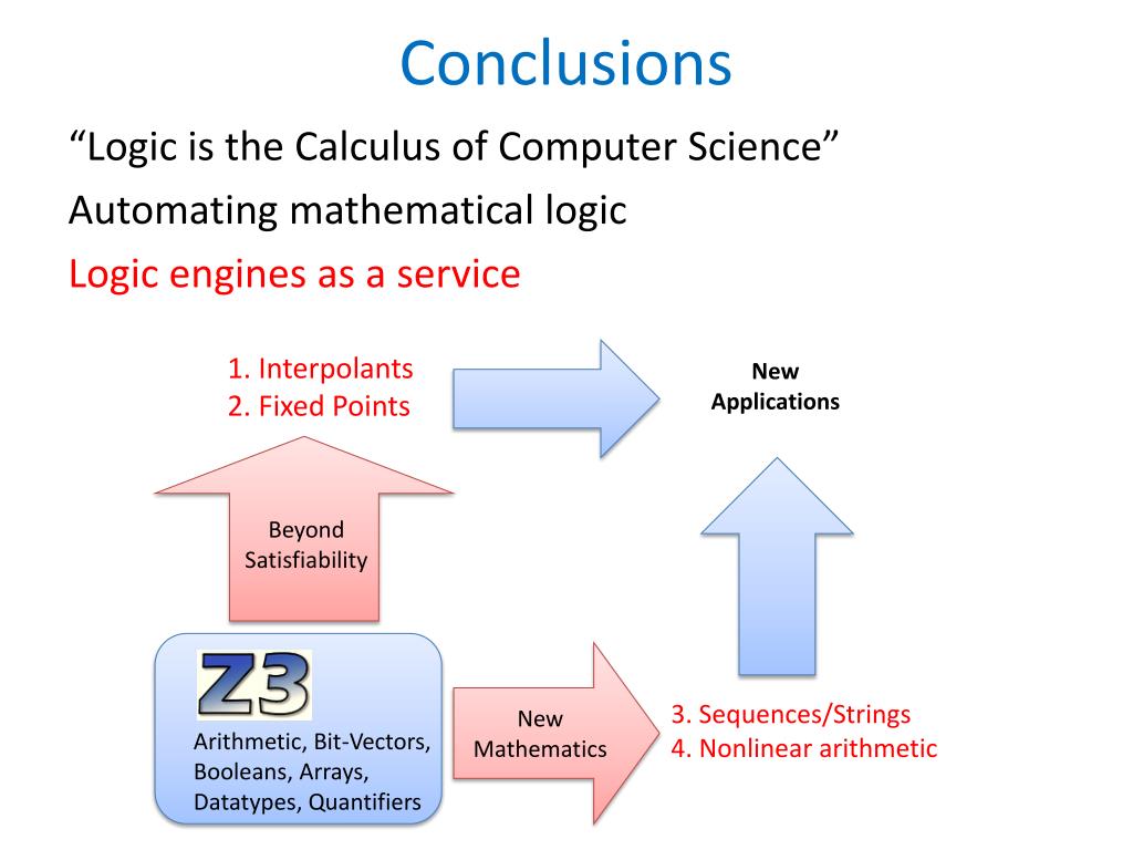 Conclusions 1. Interpolants 2. Fixed Points New Applications “Logic is the Calculus of Computer Science” Automating mathematical logic Logic engines as a service Beyond Satisfiability Arithmetic, Bit-Vectors, Booleans, Arrays, Datatypes, Quantifiers New Mathematics 3. Sequences/Strings 4. Nonlinear arithmetic