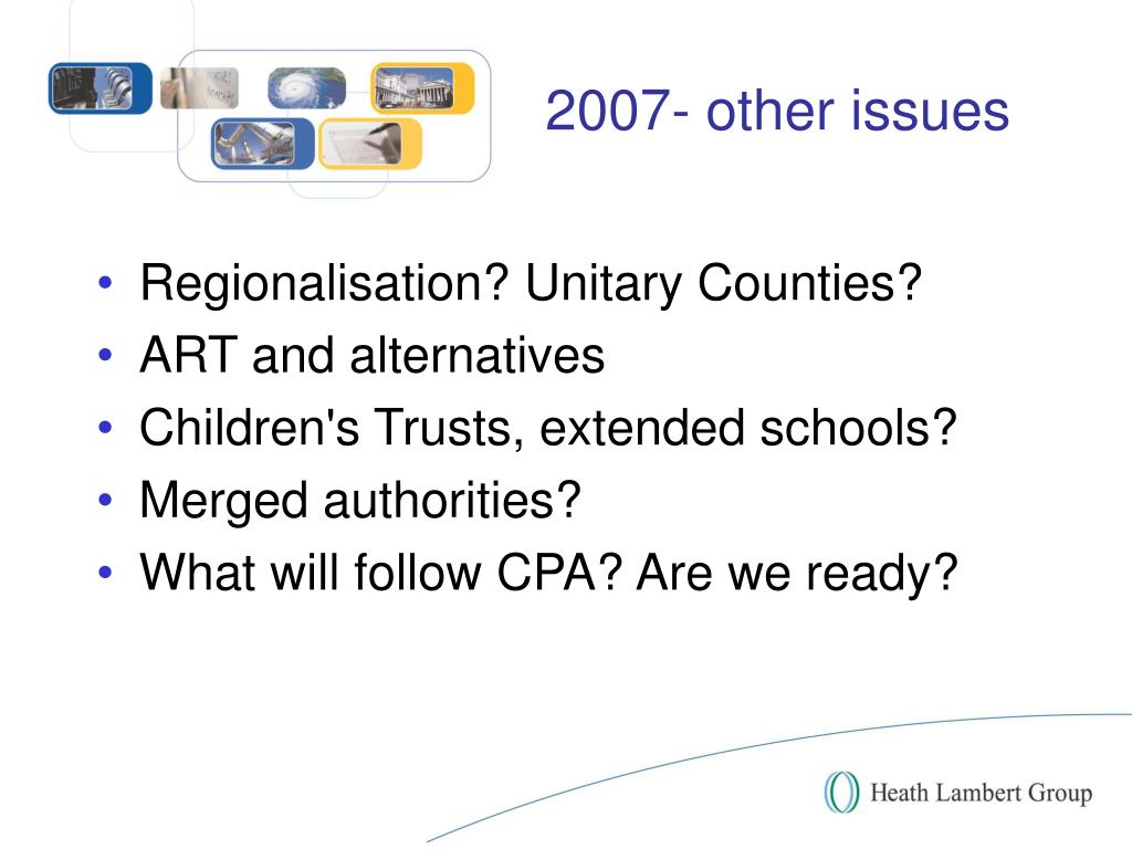 2007- other issues • Regionalisation? Unitary Counties? • ART and alternatives • Children's Trusts, extended schools? • Merged authorities? • What will follow CPA? Are we ready?