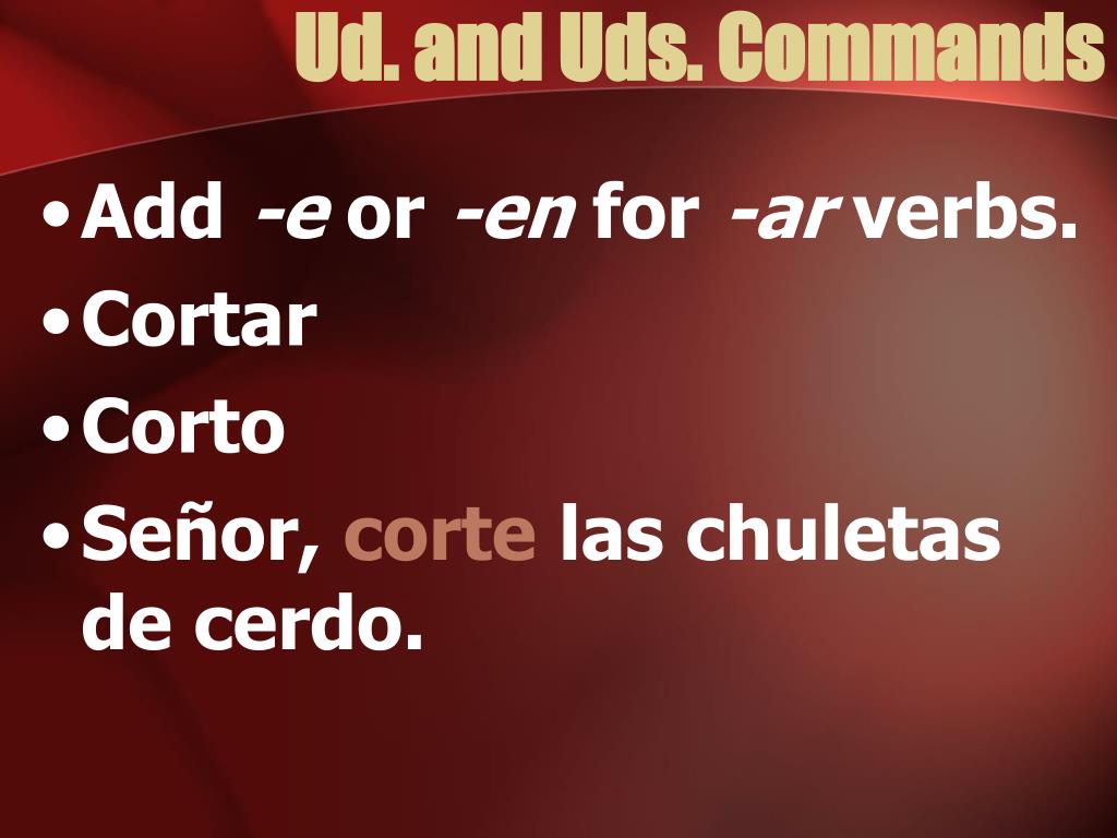 Ud. and Uds. Commands • Add -e or -en for -ar verbs. • Cortar • Corto • Señor, corte las chuletas de cerdo.