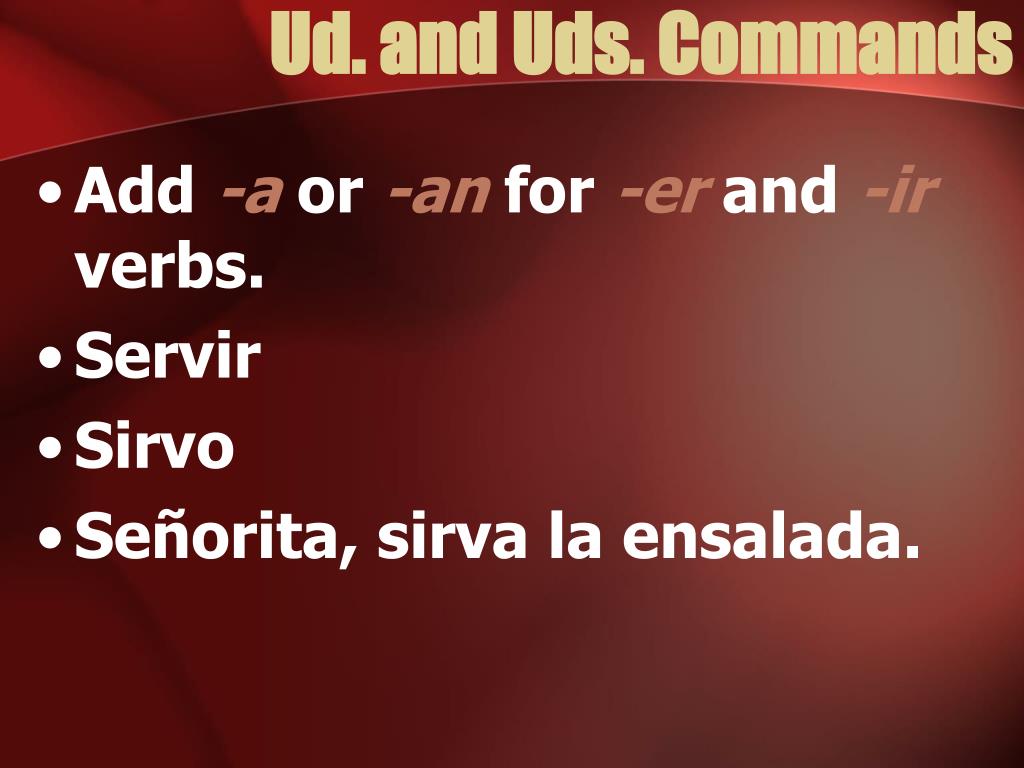 Ud. and Uds. Commands • Add -a or -an for -er and -ir verbs. • Servir • Sirvo • Señorita, sirva la ensalada.
