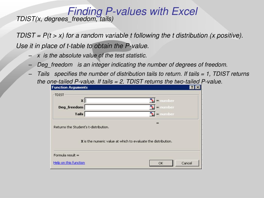 Finding P-values with Excel TDIST(x, degrees_freedom, tails) TDIST = P(t > x) for a random variable t following the t distribution (x positive).Use it in place of t-table to obtain the P-value. • x is the absolute value of the test statistic. • Deg_freedom is an integer indicating the number of degrees of freedom. • Tails specifies the number of distribution tails to return. If tails = 1, TDIST returns the one-tailed P-value. If tails = 2, TDIST returns the two-tailed P-value.