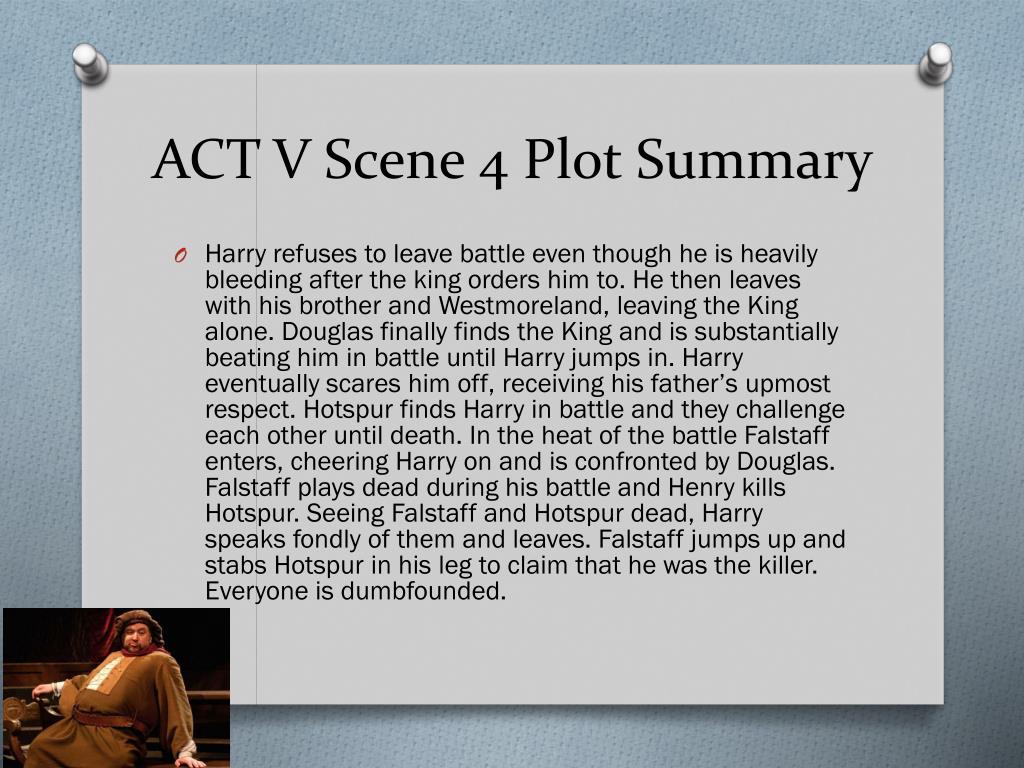 ACT V Scene 4 Plot Summary • Harry refuses to leave battle even though he is heavily bleeding after the king orders him to. He then leaves with his brother and Westmoreland, leaving the King alone. Douglas finally finds the King and is substantially beating him in battle until Harry jumps in. Harry eventually scares him off, receiving his father’s upmost respect. Hotspur finds Harry in battle and they challenge each other until death. In the heat of the battle Falstaff enters, cheering Harry on and is confronted by Douglas. Falstaff plays dead during his battle and Henry kills Hotspur. Seeing Falstaff and Hotspur dead, Harry speaks fondly of them and leaves. Falstaff jumps up and stabs Hotspur in his leg to claim that he was the killer. Everyone is dumbfounded.