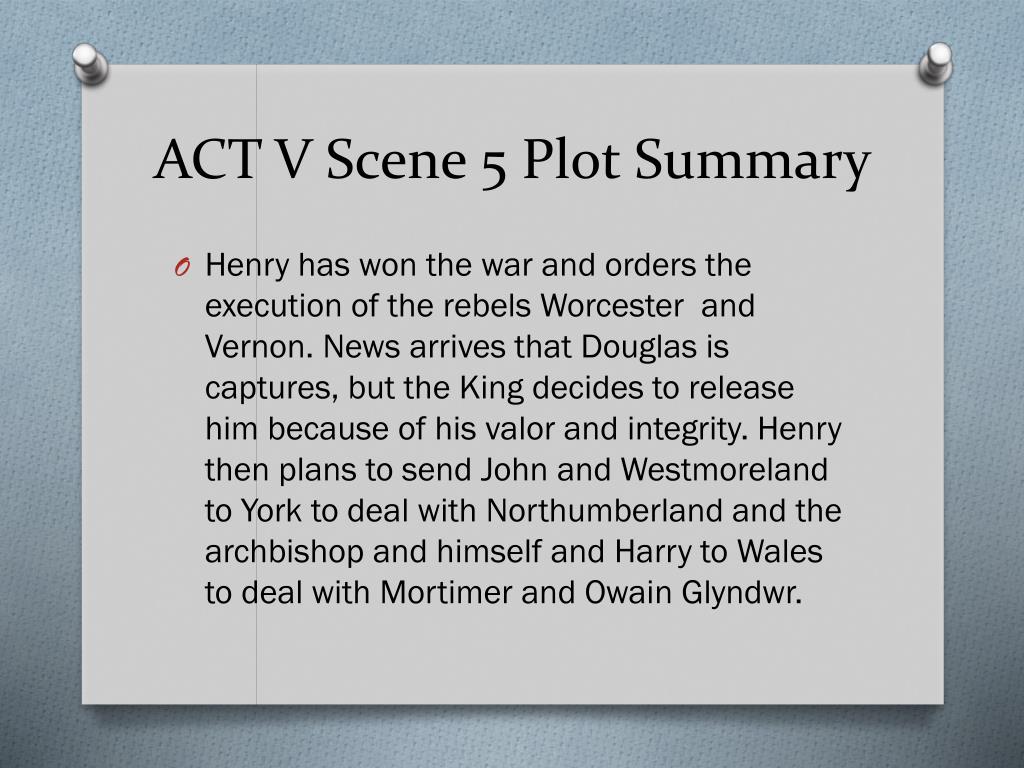 ACT V Scene 5 Plot Summary • Henry has won the war and orders the execution of the rebels Worcester and Vernon. News arrives that Douglas is captures, but the King decides to release him because of his valor and integrity. Henry then plans to send John and Westmoreland to York to deal with Northumberland and the archbishop and himself and Harry to Wales to deal with Mortimer and Owain Glyndwr.